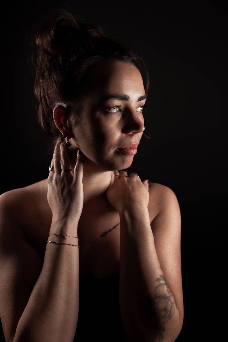 Het portret wordt gemaakt tegen een zwarte achtergrond. Ik neem het achtergronddoek zelf mee; je neemt plaats op een stoel, zodat we in alle rust kunnen werken. Door de eenvoud van licht en achtergrond gaat alle aandacht volledig naar jou.